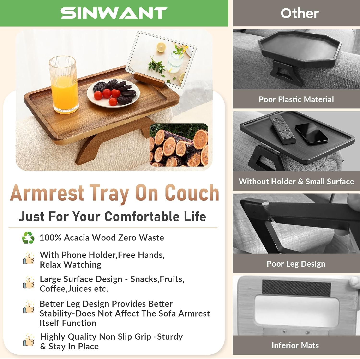 The SINWANT Bamboo Armrest Tray Table transforms your sofa arm into a stable surface for drinks, snacks, remotes, and devices. Made from premium natural bamboo, it features a non-slip base, flexible slats to fit most armrests, and a built-in phone holder for added convenience. Its foldable, lightweight design makes it perfect for small spaces and everyday use. Discover how this smart accessory can elevate your lounging experience—explore it now.